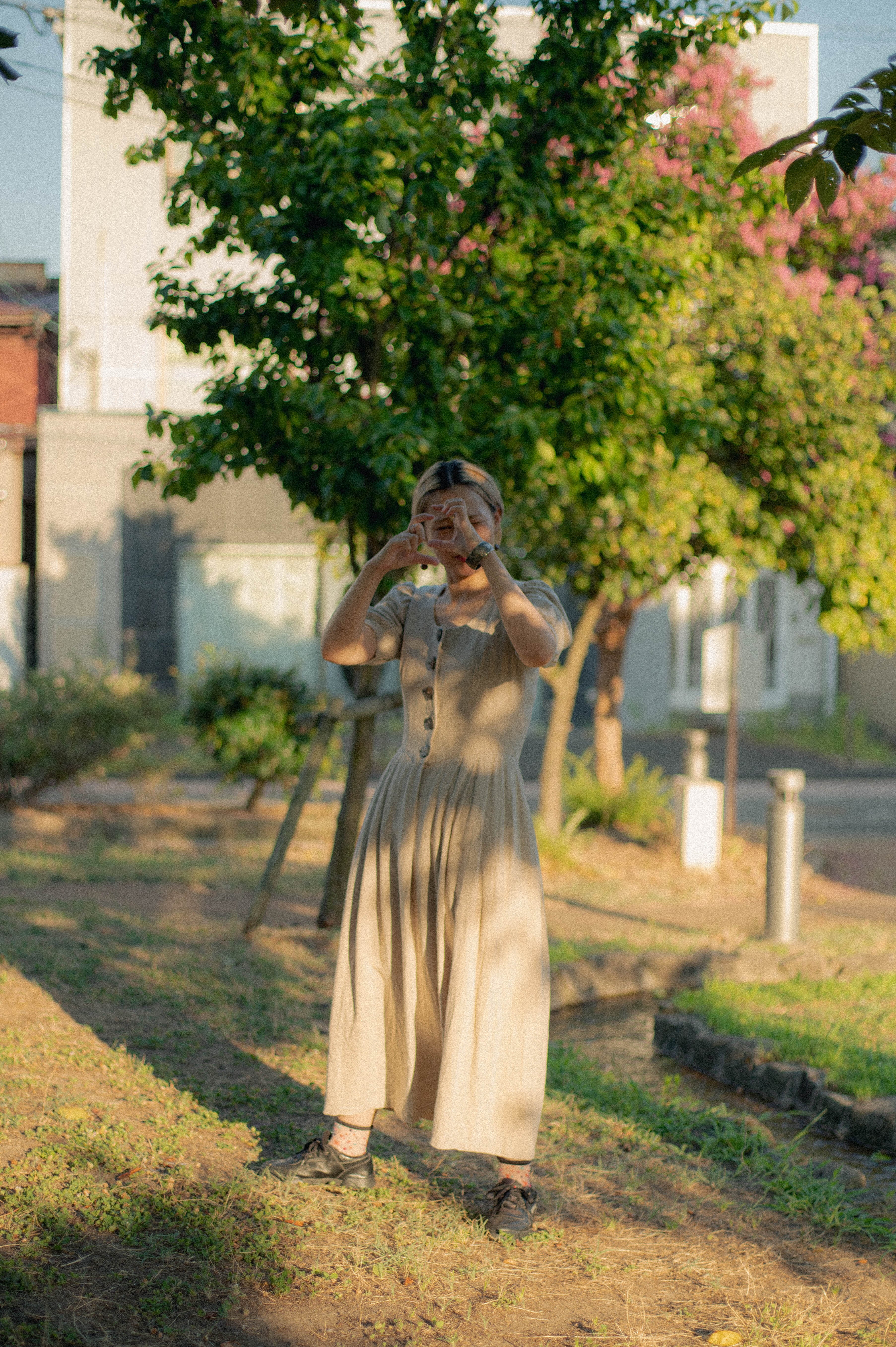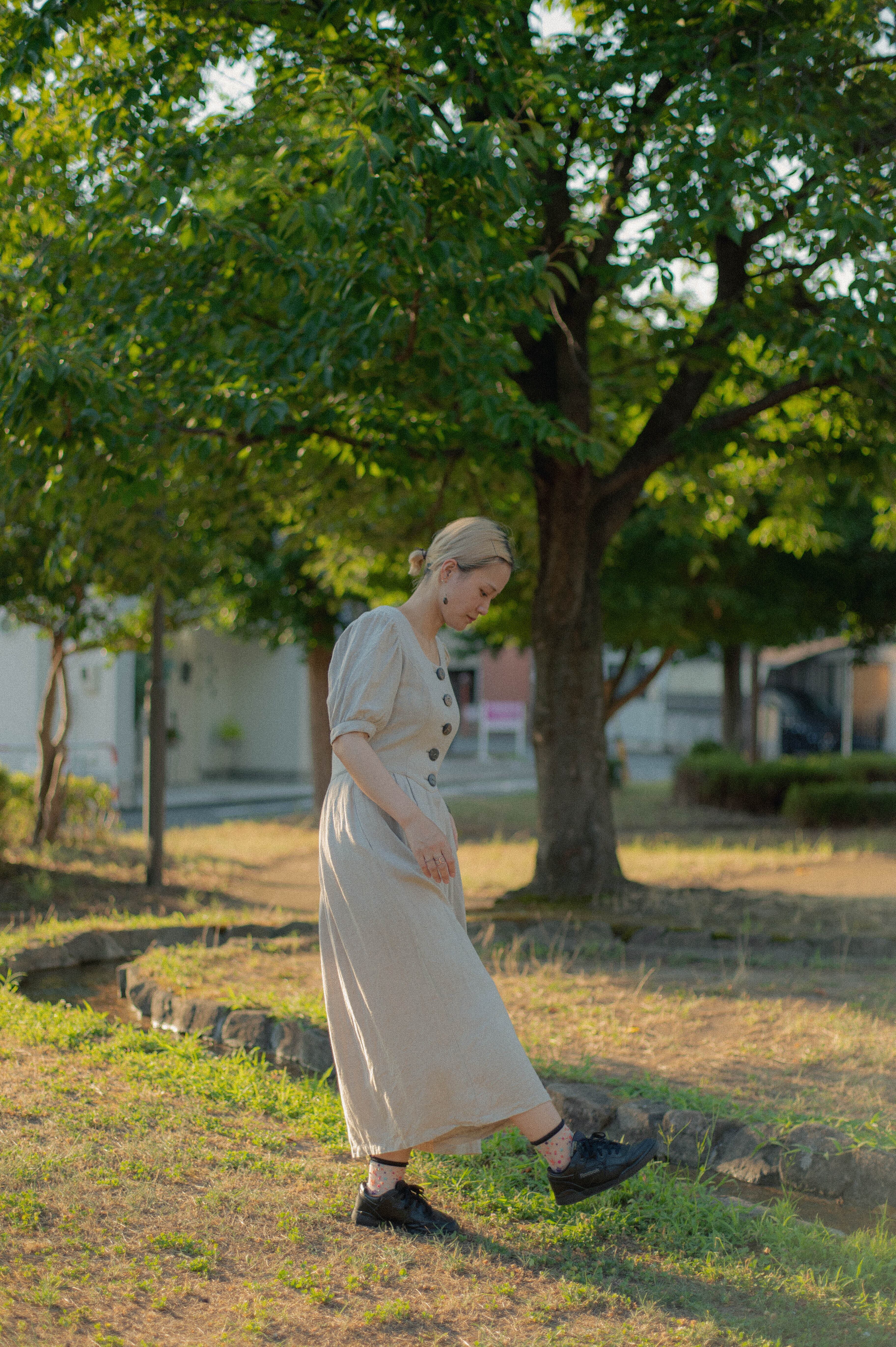 ボタン、パフスリーブ、プリーツ、かわいいポイントがたくさんの嬉しいワンピースです。