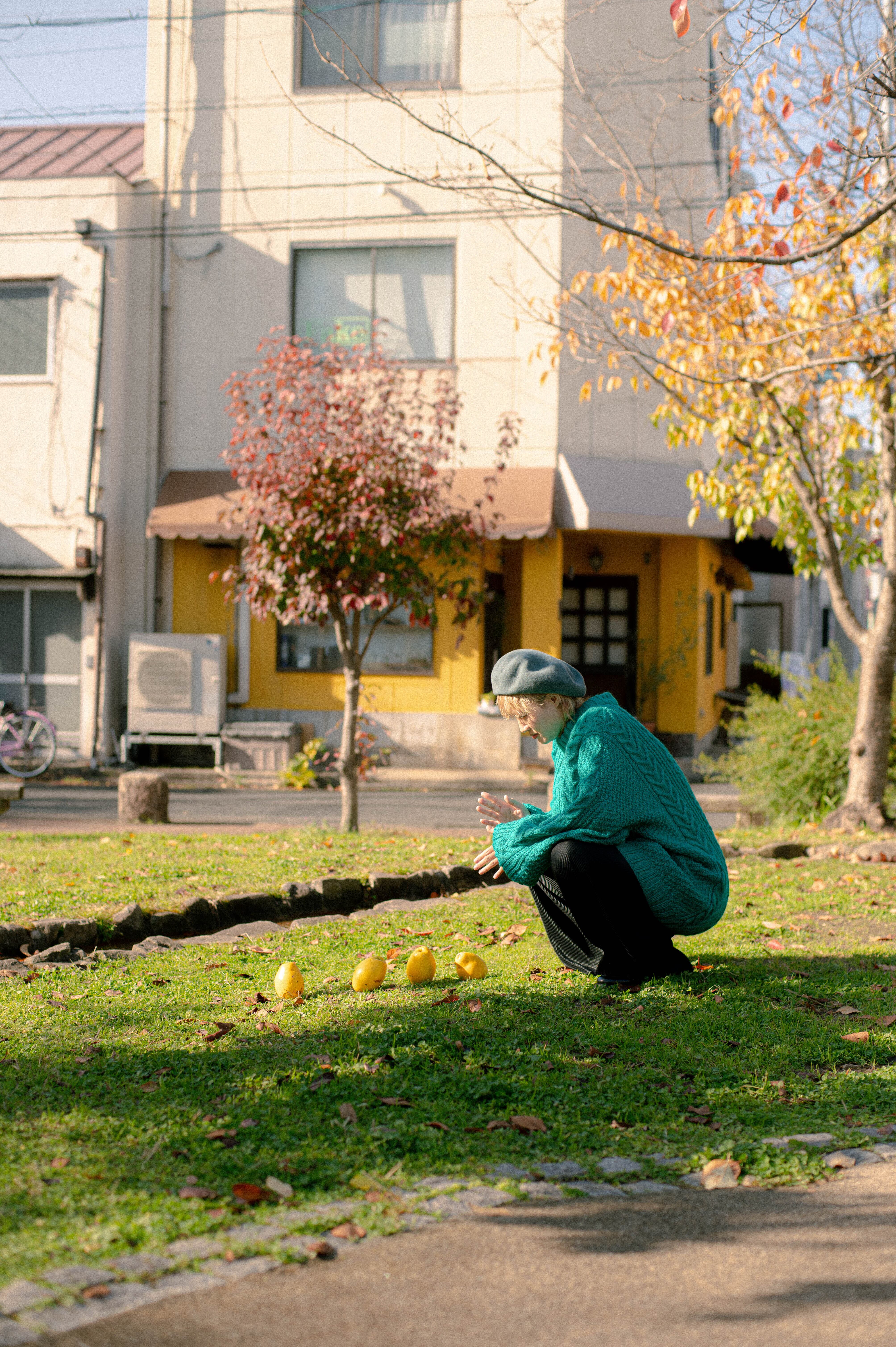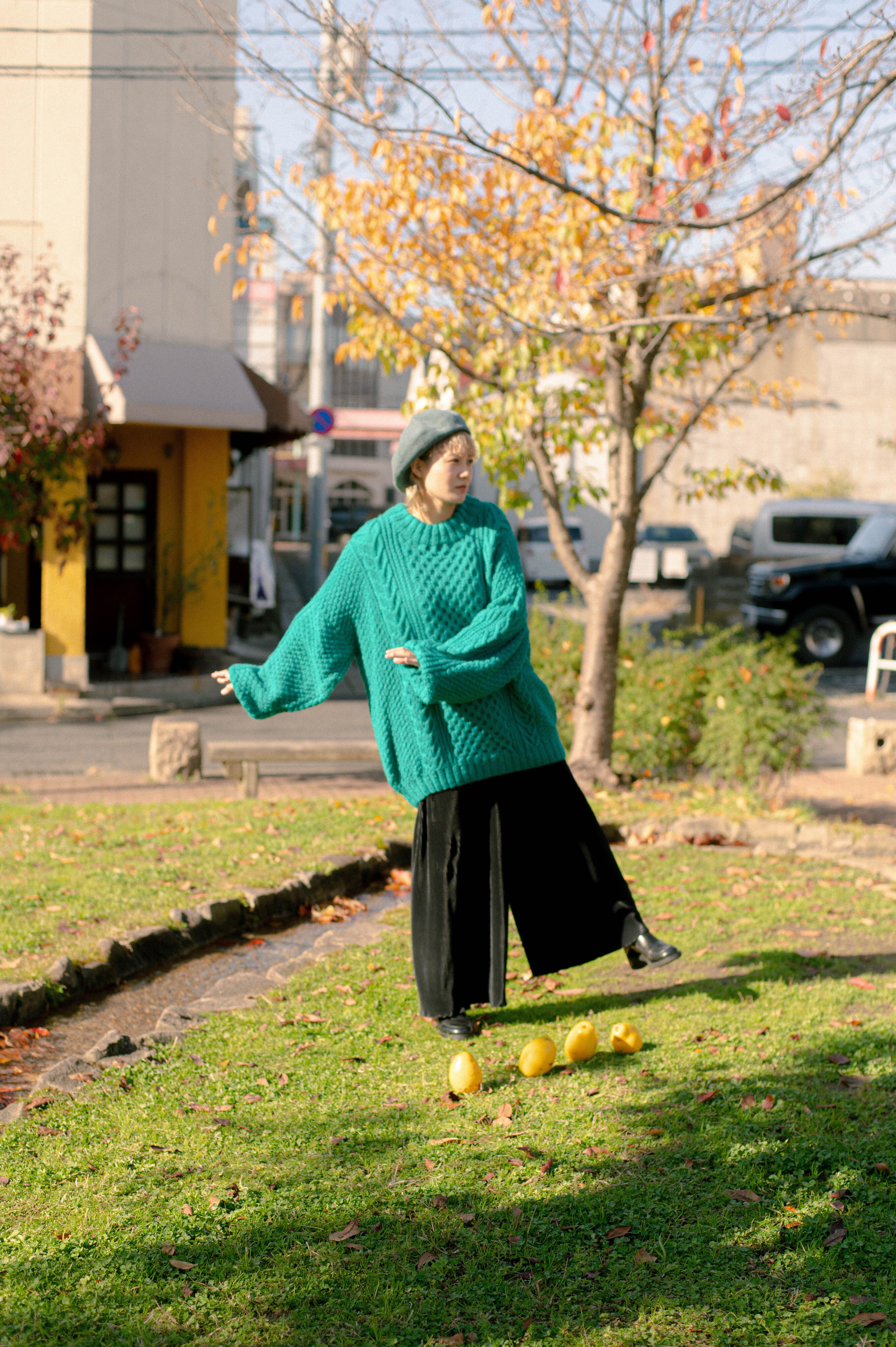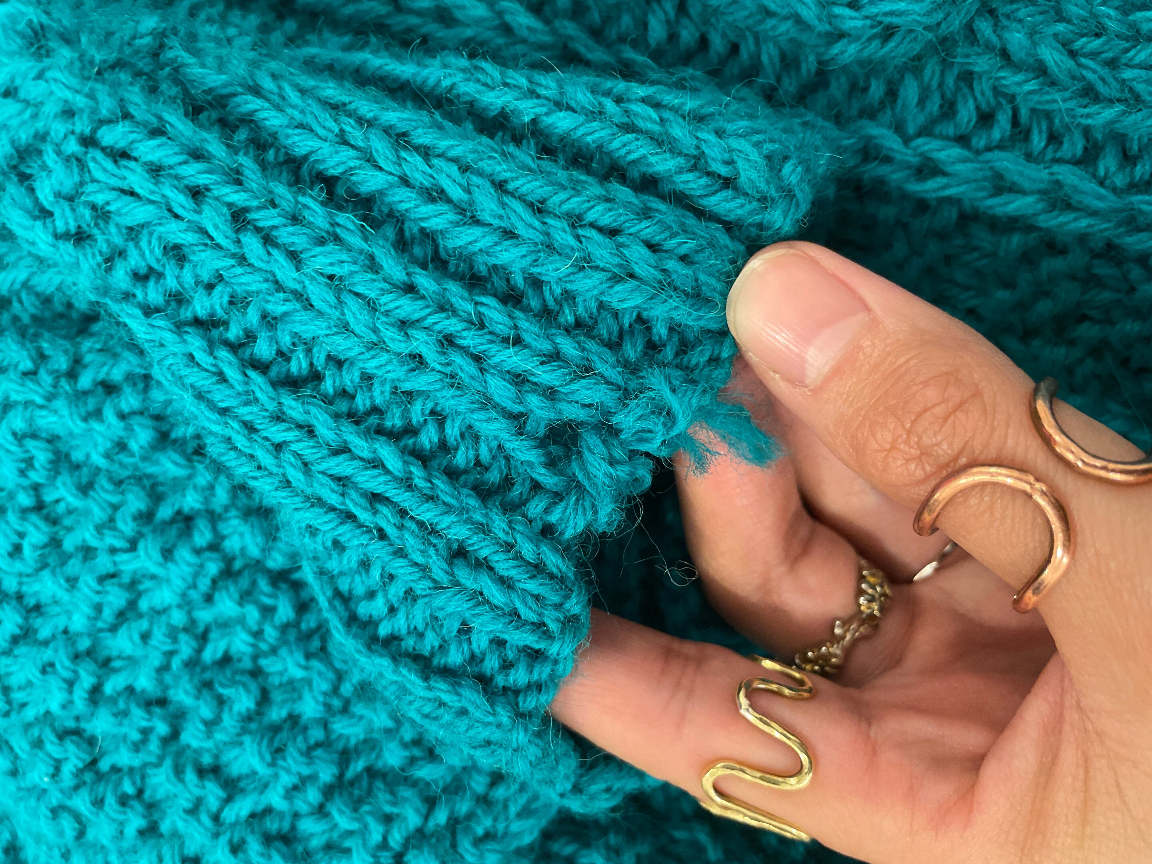 発色抜群の青緑が編み地を引き立ててくれます。